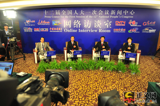 3月11日下午,十二屆全國(guó)人大一次會(huì)議新聞中心舉辦主題為“強(qiáng)化監(jiān)督 執(zhí)法為民”的網(wǎng)絡(luò)訪談,邀請(qǐng)3名檢察系統(tǒng)全國(guó)人大代表,與網(wǎng)民進(jìn)行在線交流。正義網(wǎng)記者程丁 攝