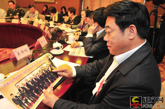 全國(guó)人大代表吳澤剛剛收到幾天前溫家寶總理與四川代表團(tuán)部分代表的合影照片,并向記者介紹自己當(dāng)時(shí)的心情。正義網(wǎng)記者 程丁/攝