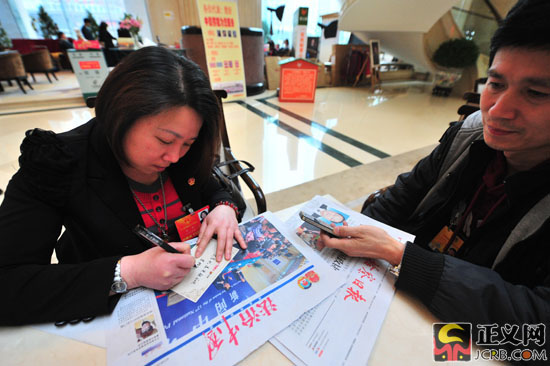 全國人大代表、江西省海外交流協(xié)會理事、江西省高安市超鷹機(jī)械制造廠車間主任吳英3月12日接受記者采訪時(shí)說:“我是來自基層的代表,也是一名新代表。我今年提交的議案建議是希望政府能幫助中小企業(yè)解決融資難、招工難、技改難的問題!辈稍L結(jié)束時(shí)吳英代表在《檢察日報(bào)》、正義網(wǎng)制作的明信片上寫下這樣一句話:“基層代表更能反映老百姓的心聲。”正義網(wǎng)記者 程丁/攝