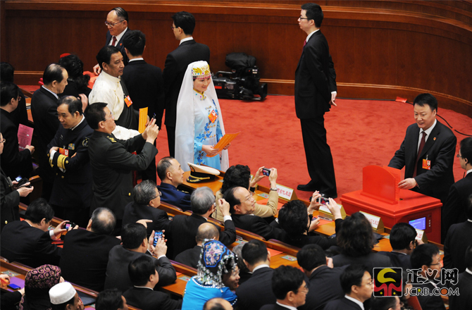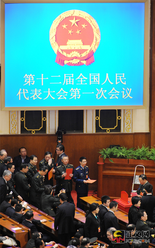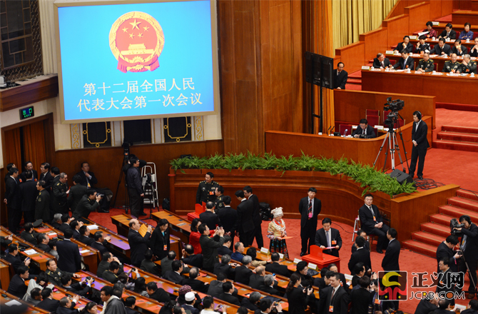 3月14日,十二屆全國人大一次會議在北京人民大會堂舉行第四次全體會議。表決關(guān)于國務(wù)院機(jī)構(gòu)改革和職能轉(zhuǎn)變方案的決定草案;表決總監(jiān)票人、監(jiān)票人名單草案;選舉第十二屆全國人民代表大會常務(wù)委員會委員長、副委員長、秘書長;選舉第十二屆全國人民代表大會常務(wù)委員會委員;選舉中華人民共和國主席、副主席;選舉中華人民共和國中央軍事委員會主席。肖杰 攝