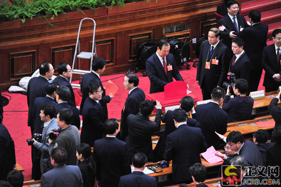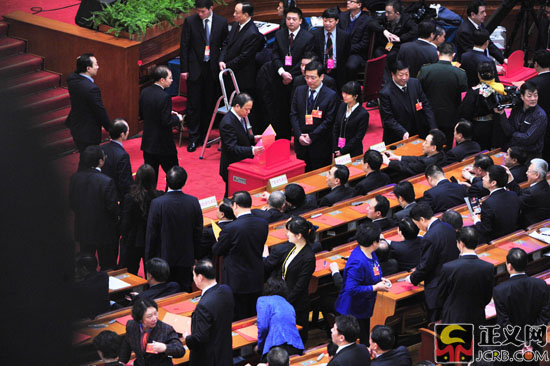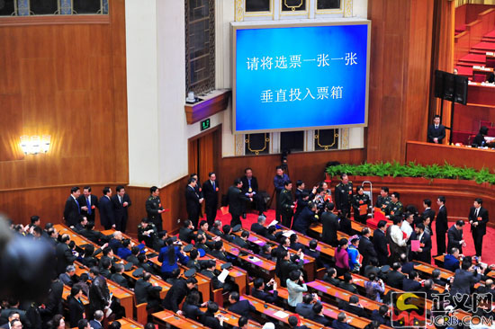 3月14日,十二屆全國人大一次會(huì)議在北京人民大會(huì)堂舉行第四次全體會(huì)議,選舉第十二屆全國人民代表大會(huì)常務(wù)委員會(huì)委員長、副委員長、秘書長;選舉第十二屆全國人民代表大會(huì)常務(wù)委員會(huì)委員;選舉中華人民共和國主席、副主席;選舉中華人民共和國中央軍事委員會(huì)主席。圖為全國人大代表們?cè)谕镀。正義網(wǎng)記者 程丁/攝