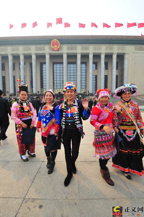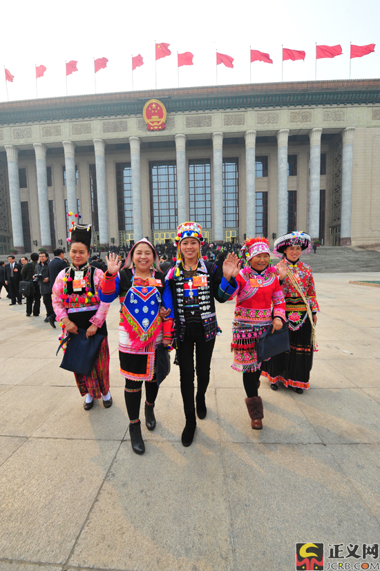 3月16日下午,十二屆全國(guó)人民代表大會(huì)第一次會(huì)議在人民大會(huì)堂舉行第六次全體會(huì)議,決定國(guó)務(wù)院副總理等人選;表決十二屆全國(guó)人民代表大會(huì)各專(zhuān)門(mén)委員會(huì)主任委員、副主任委員、委員名單草案。圖為云南代表團(tuán)代表著盛裝出席大會(huì)。正義網(wǎng)記者程丁 攝