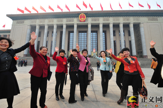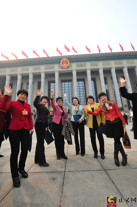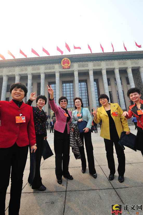 3月16日下午,十二屆全國(guó)人民代表大會(huì)第一次會(huì)議在人民大會(huì)堂舉行第六次全體會(huì)議,決定國(guó)務(wù)院副總理等人選;表決十二屆全國(guó)人民代表大會(huì)各專(zhuān)門(mén)委員會(huì)主任委員、副主任委員、委員名單草案。圖為幾位女代表著盛裝出席大會(huì)。正義網(wǎng)記者程丁 攝