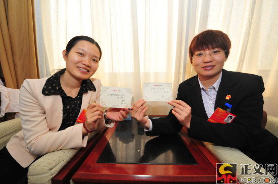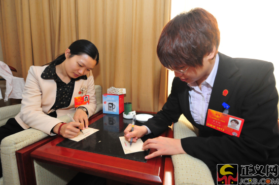 兩位代表在《檢察日報》、正義網(wǎng)制作的兩會明信片上寫下自己對公平正義的理解。正義網(wǎng)記者程丁 攝