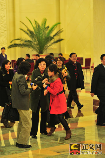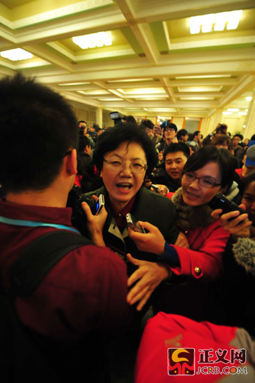 3月16日下午,十二屆全國(guó)人民代表大會(huì)第一次會(huì)議在人民大會(huì)堂舉行第六次全體會(huì)議。決定國(guó)務(wù)院副總理、國(guó)務(wù)委員、各部部長(zhǎng)等人選。圖為會(huì)議結(jié)束后,新任衛(wèi)生部部長(zhǎng)李斌被一位女記者帶到媒體區(qū)接受集體采訪。正義網(wǎng)記者程丁 攝