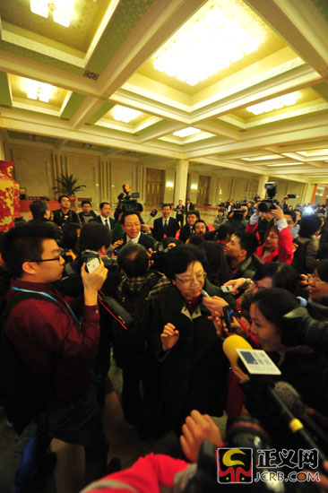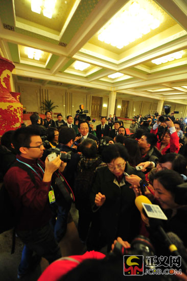 3月16日下午,十二屆全國(guó)人民代表大會(huì)第一次會(huì)議在人民大會(huì)堂舉行第六次全體會(huì)議。決定國(guó)務(wù)院副總理、國(guó)務(wù)委員、各部部長(zhǎng)等人選。大會(huì)結(jié)束后,農(nóng)業(yè)部部長(zhǎng)韓長(zhǎng)賦(上中)、新任國(guó)家衛(wèi)生和計(jì)劃生育委員會(huì)主任李斌(下中)被媒體團(tuán)團(tuán)包圍。正義網(wǎng)記者程丁 攝