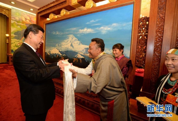3月9日,中共中央總書記、中共中央軍委主席習近平參加十二屆全國人大一次會議西藏代表團的審議。這是一位代表向習近平獻上哈達。 新華社記者馬占成 攝