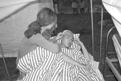 昨晚7時(shí),在天全縣人民醫(yī)院,醫(yī)患人員全部轉(zhuǎn)移到了臨時(shí)搭起的帳篷。在其中一張病床上,傷員呂才文靜靜躺著,頭上紗布滲出的血跡已干,女友肖琴在一旁陪著他。