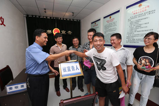 庭審中,原告的親屬聞訊趕來,與被告人家屬言語不和,險些動起手來,法警經(jīng)過耐心勸導,使庭審順利完成。