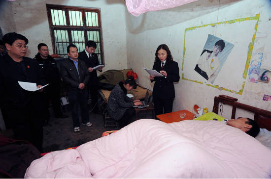 開庭當天,檢察官、法官帶領著書記員、法警冒著嚴寒來到被告人家中,在被告人的病床邊完成了案件庭審。