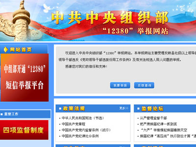 中組部12月正式開通了“12380”短信舉報平臺,形成了信件、電話、網絡、短信“四位一體”的“12380”綜合舉報受理平臺,主要受理反映違規(guī)違紀選人用人問題的舉報。