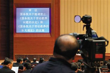 12月28日,十二屆全國人大常委會第六次會議閉幕,會議通過廢止勞教制度的決定,根據(jù)決定,勞教制度廢止前,依法作出的勞教決定有效。