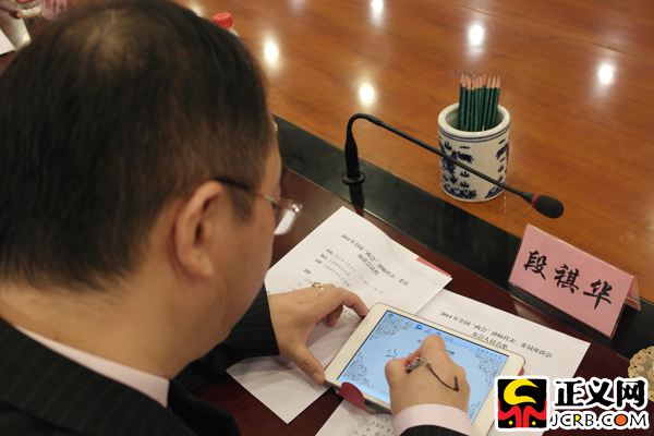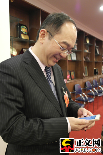 段祺華贊代表委員手機(jī)報(bào)內(nèi)容精信息量大。正義網(wǎng)記者 曹麗輝/攝