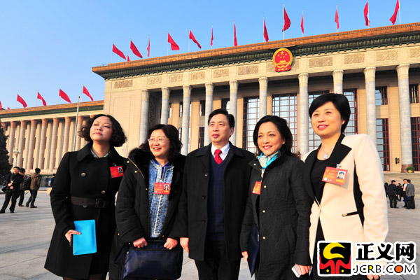 3月9日上午,第十二屆全國人民代表大會(huì)第二次會(huì)議在人民大會(huì)堂舉行第二次全體會(huì)議,聽取全國人大常委會(huì)委員長張德江作全國人大常委會(huì)工作報(bào)告。全國人大代表、重慶市川劇院院長沈鐵梅(右二)和同團(tuán)代表在大會(huì)堂前合影留念。正義網(wǎng)記者 程丁/攝