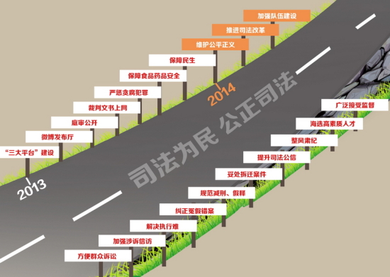 孫軍工在訪談中表示,今年周院長(zhǎng)的報(bào)告信息量很大,比較全面地展現(xiàn)了人民法院的工作。報(bào)告的體例與往年大致相同,主要分為2013年工作回顧和2014年展望兩部分,其中對(duì)去年工作總結(jié)的內(nèi)容占了較大篇幅。“為了使廣大網(wǎng)友更準(zhǔn)確、直觀地把握?qǐng)?bào)告的內(nèi)容,我從報(bào)告里梳理了20個(gè)關(guān)鍵詞,并且制作了一幅漫畫(huà),用來(lái)對(duì)工作報(bào)告進(jìn)行一個(gè)整體的解讀和說(shuō)明。”孫軍工當(dāng)即展開(kāi)了手中的漫畫(huà),這個(gè)漫畫(huà)整體內(nèi)容由一條道路和20個(gè)路標(biāo)組成,孫軍工介紹,這一條道路就是人民法院“司法為民、公正司法”的工作主線,20個(gè)路標(biāo)顯示的內(nèi)容是其提煉歸納出的17個(gè)2013年的重點(diǎn)工作和2014年的3個(gè)工作目標(biāo)!懊恳粋(gè)路標(biāo)就是一項(xiàng)具體工作,也是人民法院在全面推進(jìn)依法治國(guó)、法治國(guó)家建設(shè)的道路上闊步前行的一個(gè)個(gè)堅(jiān)實(shí)腳步,相信廣大網(wǎng)友朋友們通過(guò)看見(jiàn)這個(gè)圖就能夠?qū)θ嗣穹ㄔ汗ぷ鲌?bào)告的整體內(nèi)容有一個(gè)直觀、形象的把握了!睂O軍工介紹,同時(shí),圖中的這條“司法為民、公正司法”道路是一條緩緩向上的上坡路,這是因?yàn)槿嗣穹ㄔ旱墓ぷ饕恢笔欠(wěn)步前行的。