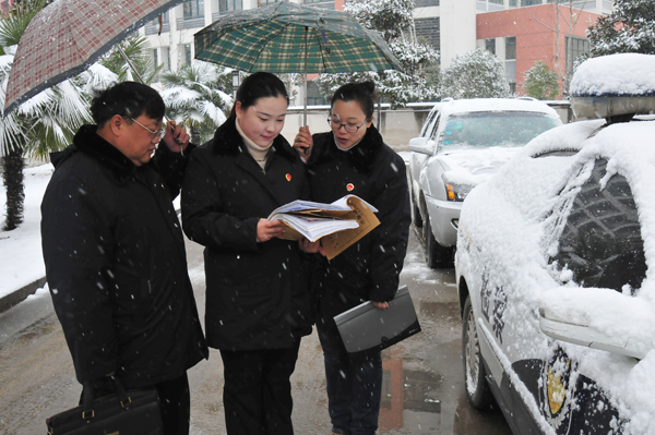 2015年1月28日,安徽省合肥市肥西縣檢察院控申檢察官踏著大雪,帶著群眾的信訪案件,深入社區(qū)進(jìn)行調(diào)查走訪,及時(shí)回應(yīng)群眾,不讓信件積壓,不讓群眾等待,做到件件有回聲,事事有著落。周云 攝