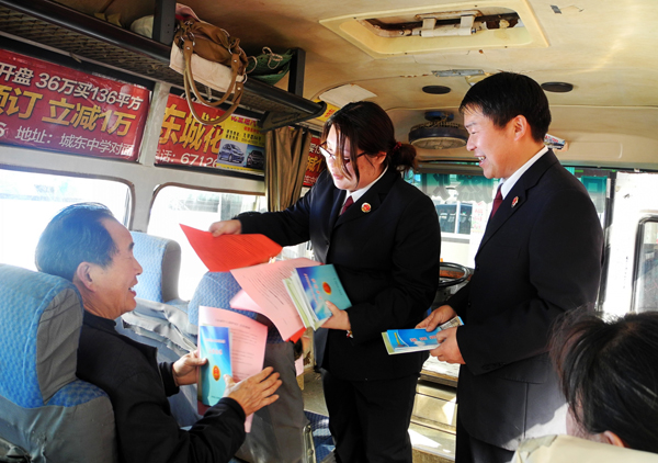 近日,安徽省鳳陽縣檢察院利用外出務工人員返鄉(xiāng)的時機,組織干警來到該縣長途汽車站,開展“走近群眾,保障民生”主題法治宣傳活動。檢察人員重點宣傳了與外出務工息息相關的法律規(guī)定,引導他們增強法律意識,遇事找法,解決問題用法,依法維護自身的合法權益。吳長忠 王競 攝