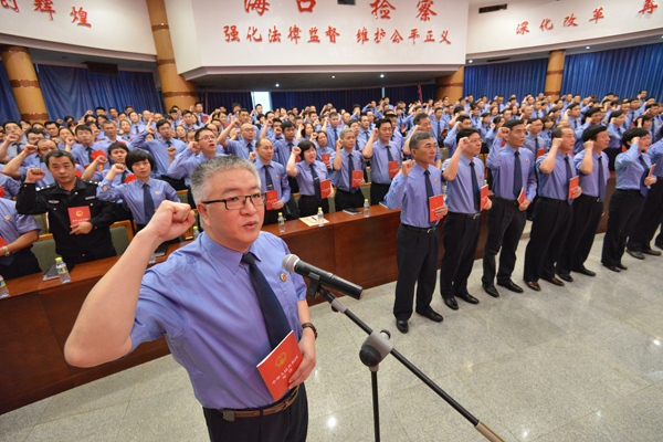 近日,海南省海口市檢察院召開(kāi)該市檢察工作會(huì)議。會(huì)前,該院舉行面向憲法宣誓儀式:鄭重承諾對(duì)黨和國(guó)家忠誠(chéng),忠于憲法和法律,牢記宗旨,堅(jiān)定信念,忠實(shí)履行檢察官的職責(zé)和使命。鄭彩娟 陳衛(wèi)東 攝