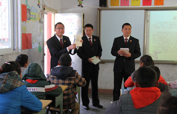 1月19日,四川省康定縣檢察院檢察官走進(jìn)三合鄉(xiāng)小學(xué),為該校高年級(jí)學(xué)生發(fā)放法制讀本,通過(guò)以案說(shuō)法等形式就相關(guān)知識(shí)進(jìn)行法制宣傳。劉德華 李吉志 陶群英 攝