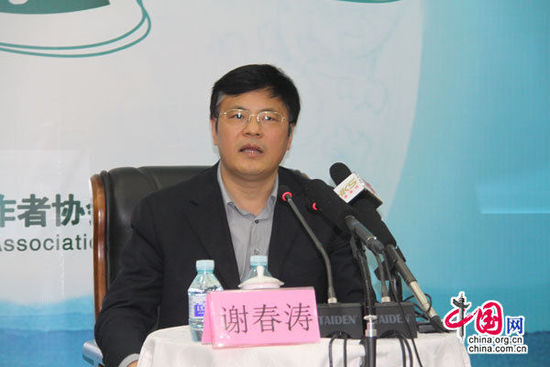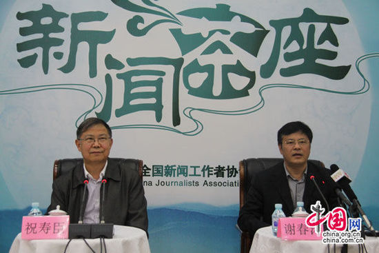 2014年10月20日,中國記協(xié)舉辦新聞茶座,中央黨校黨史教研部主任謝春濤(畫面右)講述了“中國特色社會主義”的由來與發(fā)展。中國網(wǎng)記者 張艷玲 攝