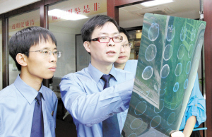 劉龍清(中)和同事一起,認真比對材料,確保鑒定的準確性。林忠 攝