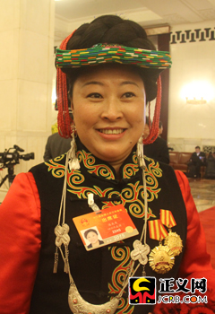 全國人大代表,四川省甘洛縣帝都酒店總經(jīng)理、喜洋洋雙語幼兒園董事長潘成英。正義網(wǎng)記者賈陽 攝