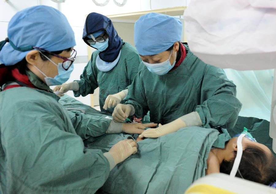 顧虹(右一)在為由她主要籌款捐助的其美拉姆實施心臟介入手術(2014年9月23日攝)。新華社記者唐召明攝