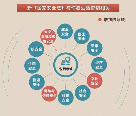 為了體現(xiàn)總體國(guó)家安全觀的要求,《中華人民共和國(guó)國(guó)家安全法》從政治安全、國(guó)土安全、軍事安全、經(jīng)濟(jì)安全、文化安全、社會(huì)安全、科技安全、信息安全、生態(tài)安全、資源安全、核安全等11個(gè)領(lǐng)域?qū)?guó)家安全任務(wù)進(jìn)行了明確。