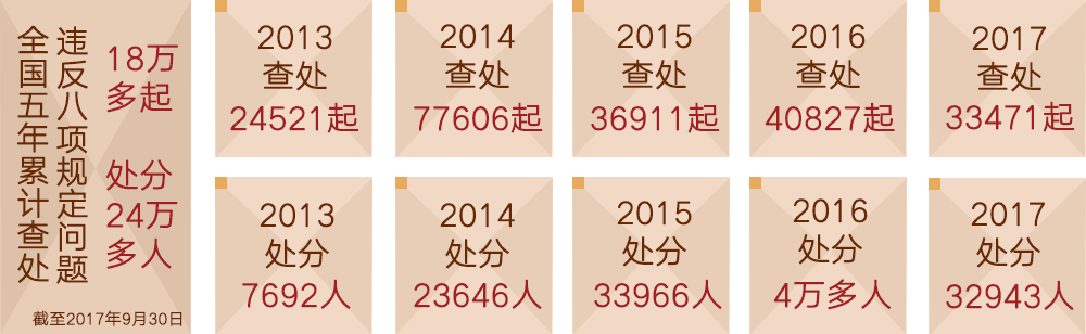 2012年12月4日,以習(xí)近平同志為核心的黨中央審議通過《關(guān)于改進(jìn)工作作風(fēng)、密切聯(lián)系群眾的八項(xiàng)規(guī)定》。2013年6月18日,習(xí)近平總書記在中國(guó)共產(chǎn)黨的群眾路線教育實(shí)踐活動(dòng)工作會(huì)議上提出了反對(duì)形式主義、官僚主義、享樂主義和奢靡之風(fēng)。由此,“反四風(fēng)”成為與八項(xiàng)規(guī)定配套的一項(xiàng)規(guī)定。5年來黨中央召開36次中央政治局常委會(huì)會(huì)議、21次中央政治局會(huì)議,對(duì)貫徹執(zhí)行中央八項(xiàng)規(guī)定、加強(qiáng)作風(fēng)建設(shè)進(jìn)行專門研究部署。截至2017年9月30日,全國(guó)累計(jì)查處違反中央八項(xiàng)規(guī)定精神問題18萬多起,處理24萬多人,平均每天超過140人。其中,省部級(jí)干部24人、廳局級(jí)干部2100多人因違反中央八項(xiàng)規(guī)定精神問題受到處理。