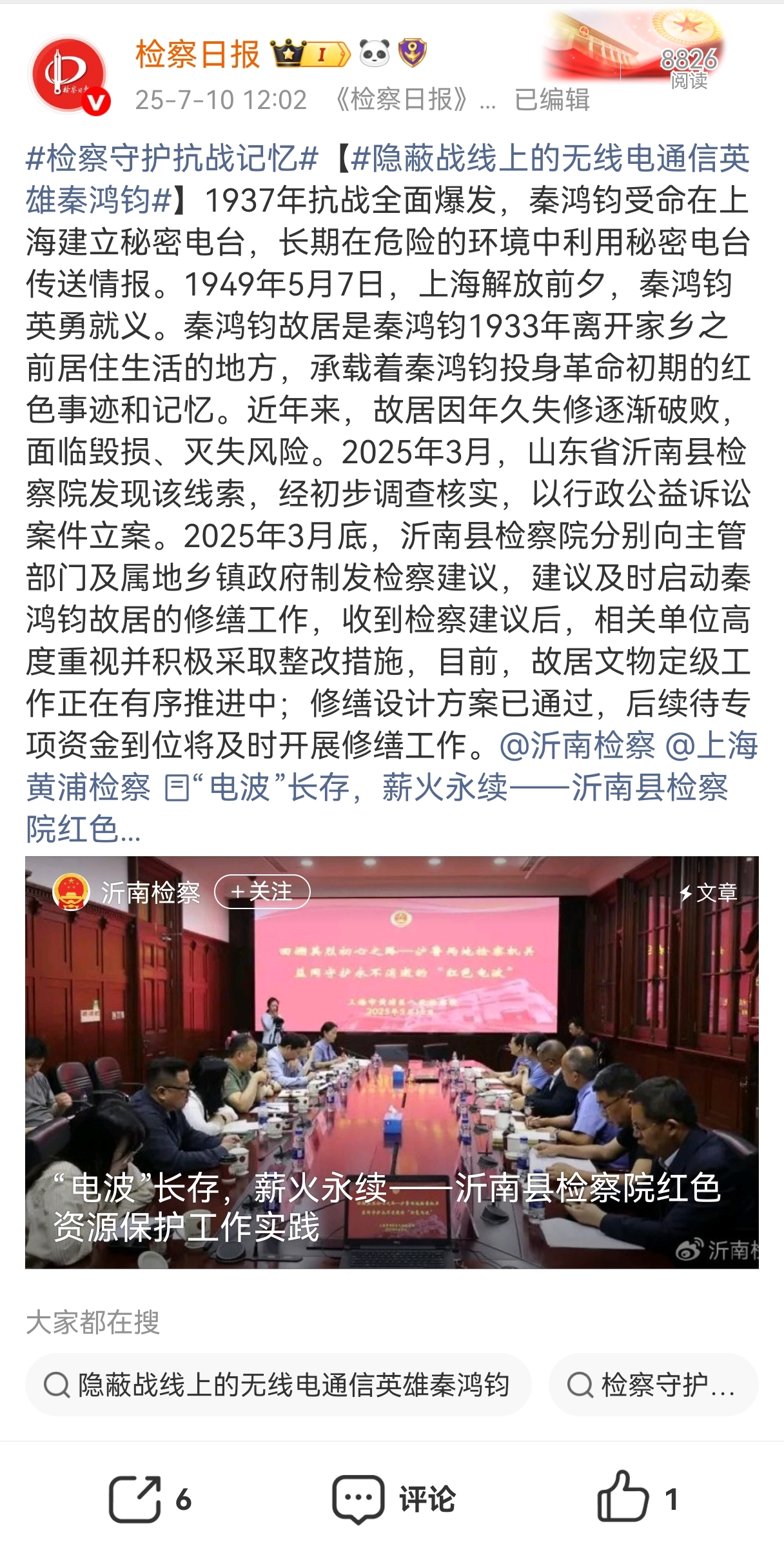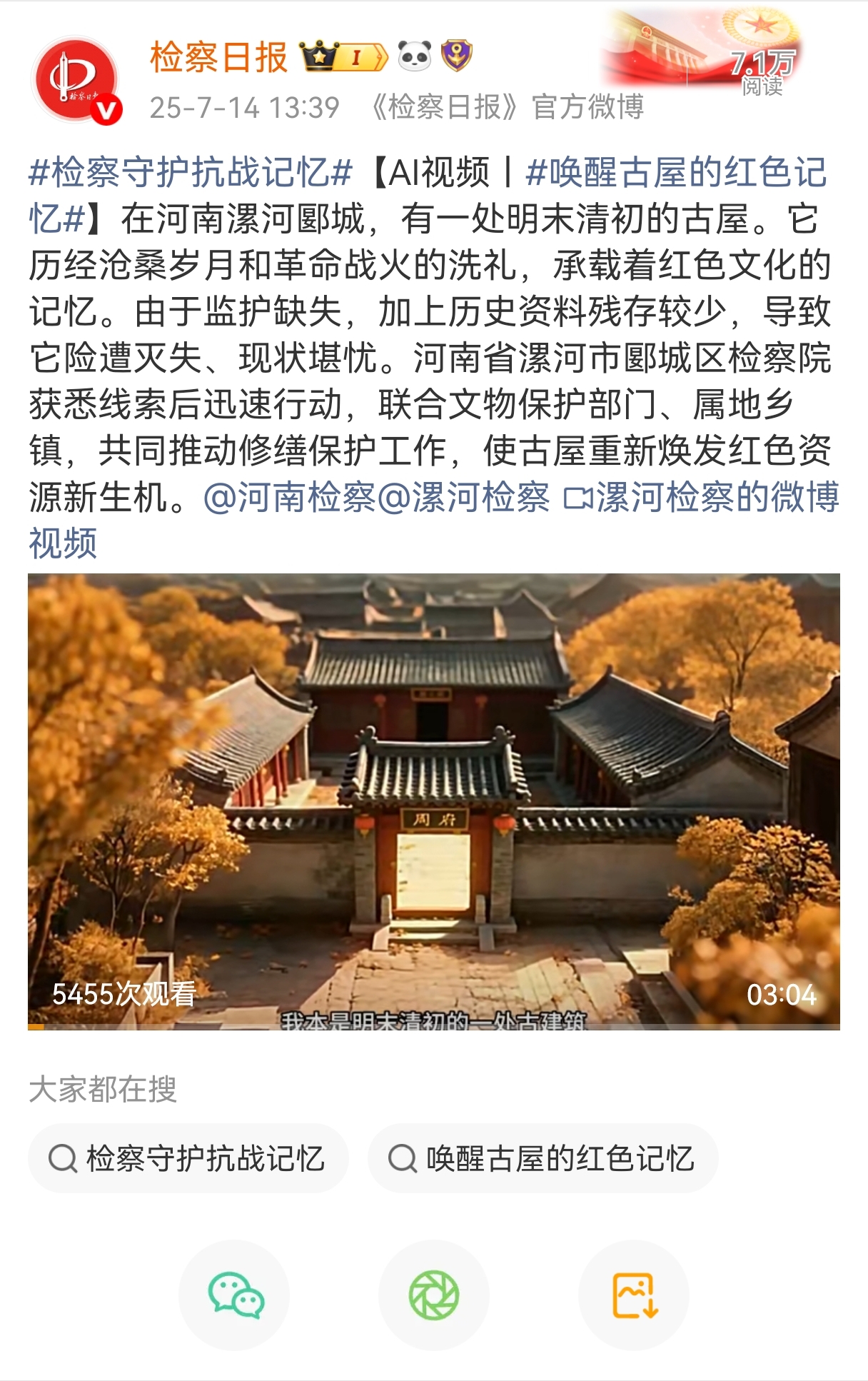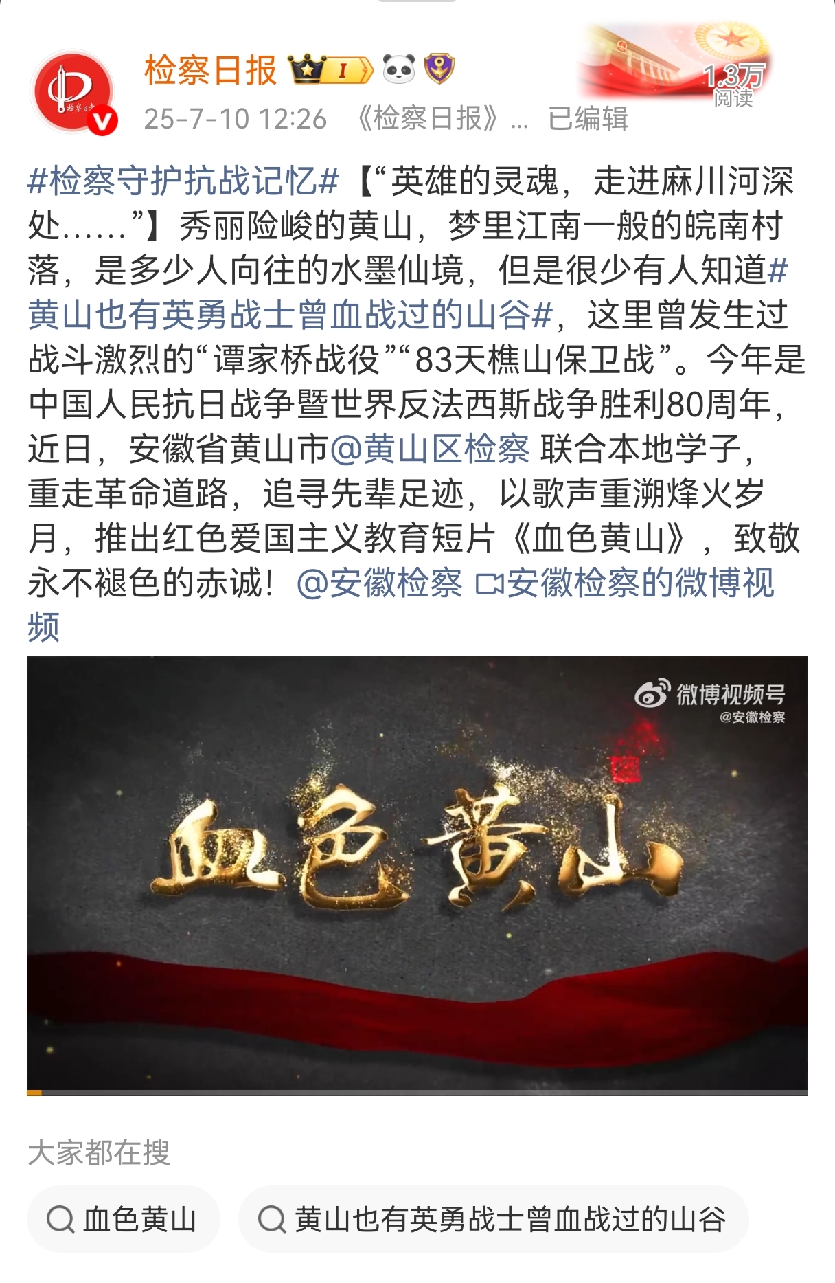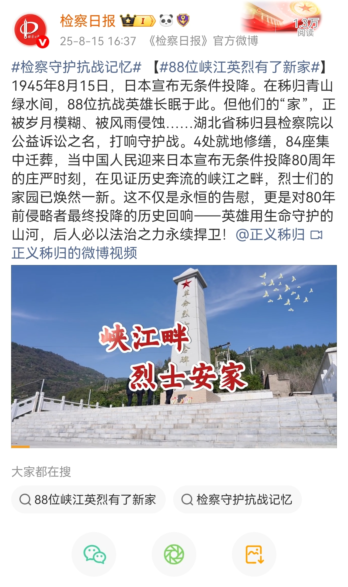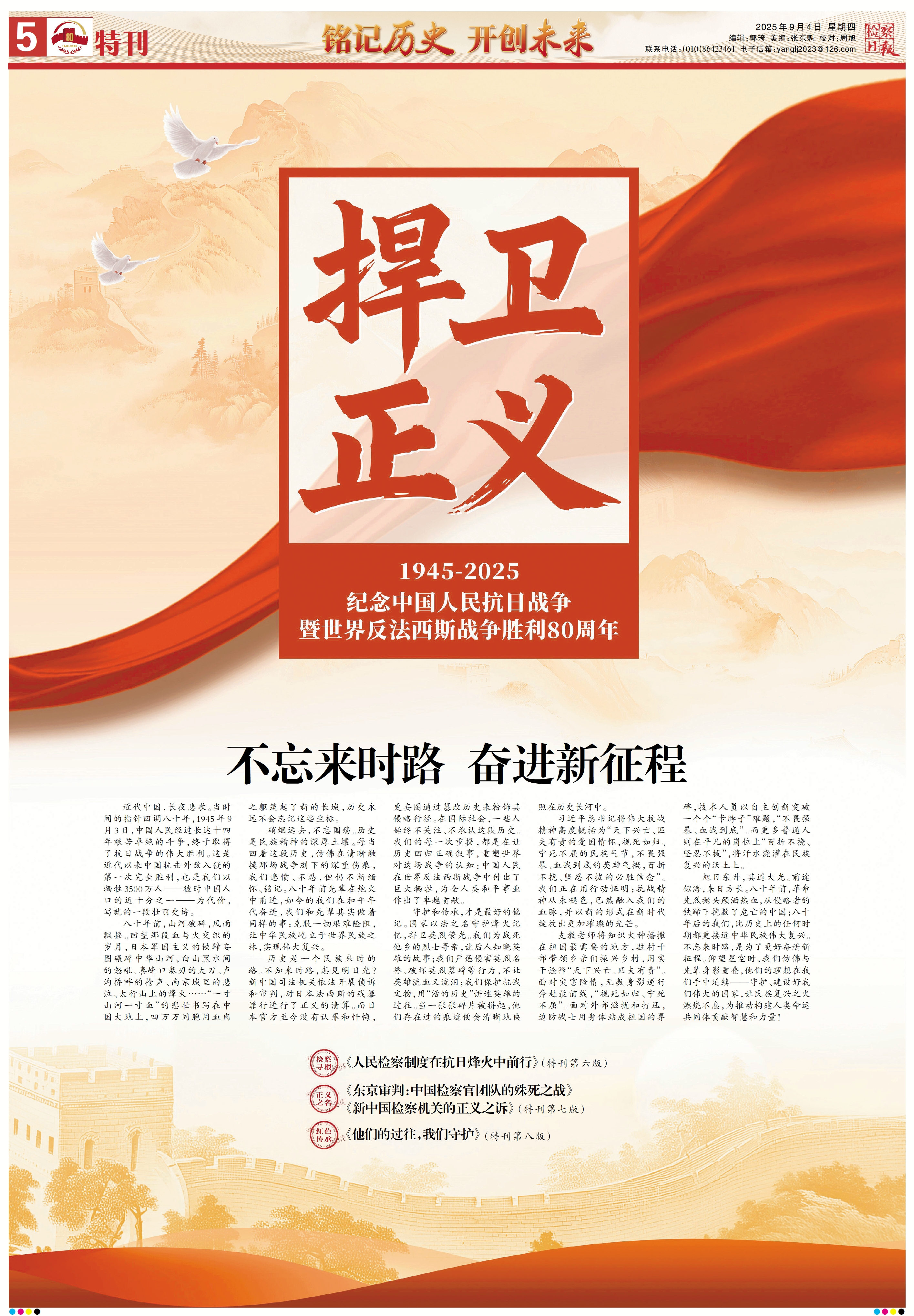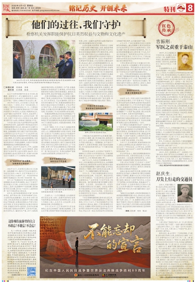 八十年歲月鎏金,八十年精神永續(xù)。當時光的指針走向中國人民抗日戰(zhàn)爭暨世界反法西斯戰(zhàn)爭勝利80周年之際,那段山河浴血、眾志成城的壯闊史詩,依然在時光長河中激蕩著震撼人心的力量;赝榛,聚焦當下,檢察日報正義網(wǎng)推出大型融媒體專題,記錄那些銘記抗戰(zhàn)歷史、守護抗戰(zhàn)記憶、傳承抗戰(zhàn)精神的檢察身影和法治足跡。