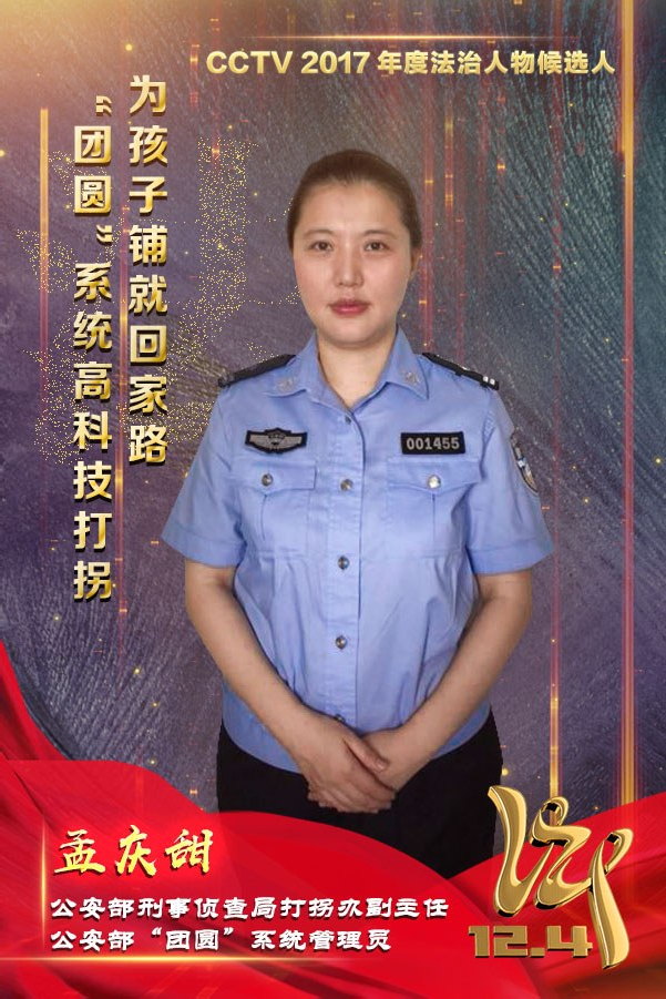 2017年11月底,中央電視臺舉辦了“2017年度法治人物評選活動”,公安部刑事偵查局打拐辦副主任孟慶甜進入候選名單,成為35組候選人的其中一個。令人沒想到的是,孟慶甜最終雖未獲獎,但其所負責的公安部“團圓”系統(tǒng)卻獲得“年度最具網(wǎng)絡影響力”獎項。