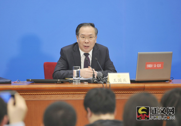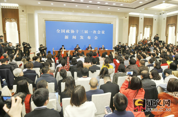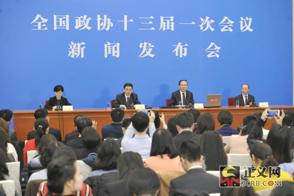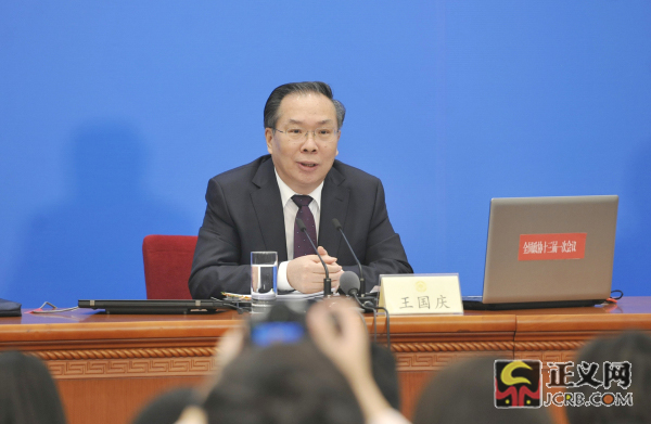 全國政協(xié)十三屆一次會議新聞發(fā)言人王國慶向中外媒體介紹本次大會有關(guān)情況并回答記者提問。正義網(wǎng)記者閆昭/攝