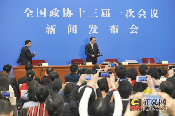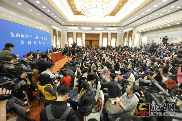 3月2日下午,全國政協(xié)十三屆一次會議新聞發(fā)布會在人民大會堂一層新聞發(fā)布廳舉行,大會新聞發(fā)言人王國慶向中外媒體介紹本次大會有關(guān)情況并回答記者提問。正義網(wǎng)記者閆昭/攝