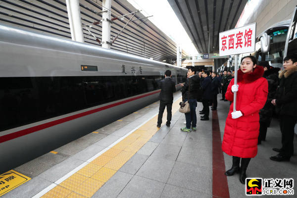 出席十三屆全國(guó)人大一次會(huì)議的湖南代表團(tuán)代表抵達(dá)北京西站,工作人員在站臺(tái)引導(dǎo)代表上車。記者張哲/攝