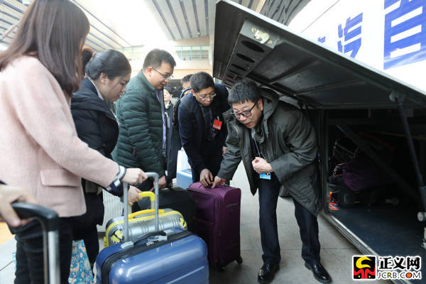 出席十三屆全國(guó)人大一次會(huì)議的湖南代表團(tuán)代表抵達(dá)北京西站,工作人員幫助代表放置行李物品。記者張哲/攝