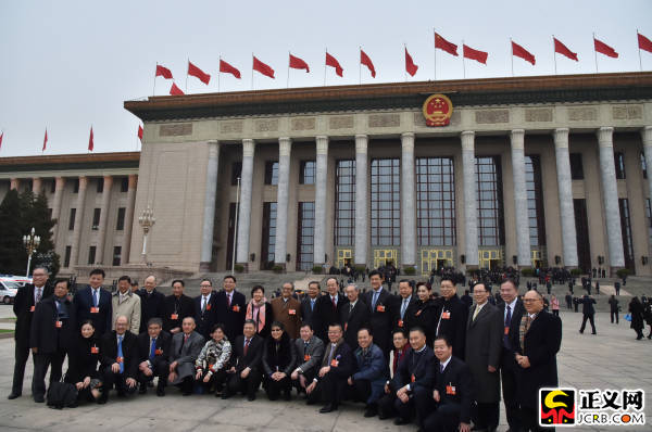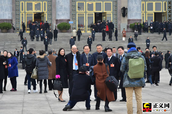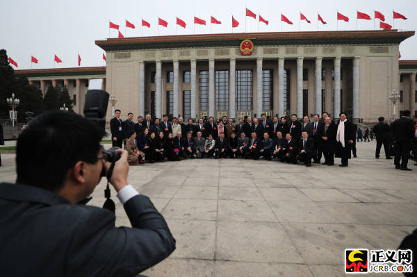 3月4日上午,十三屆全國人大一次會(huì)議舉行預(yù)備會(huì)議,湖北代表團(tuán)代表們?cè)诖髸?huì)堂前合影留念。記者程丁 攝