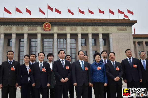 3月4日上午,十三屆全國人大一次會(huì)議舉行預(yù)備會(huì)議,寧夏代表團(tuán)代表們?cè)诖髸?huì)堂前合影留念。記者程丁 攝