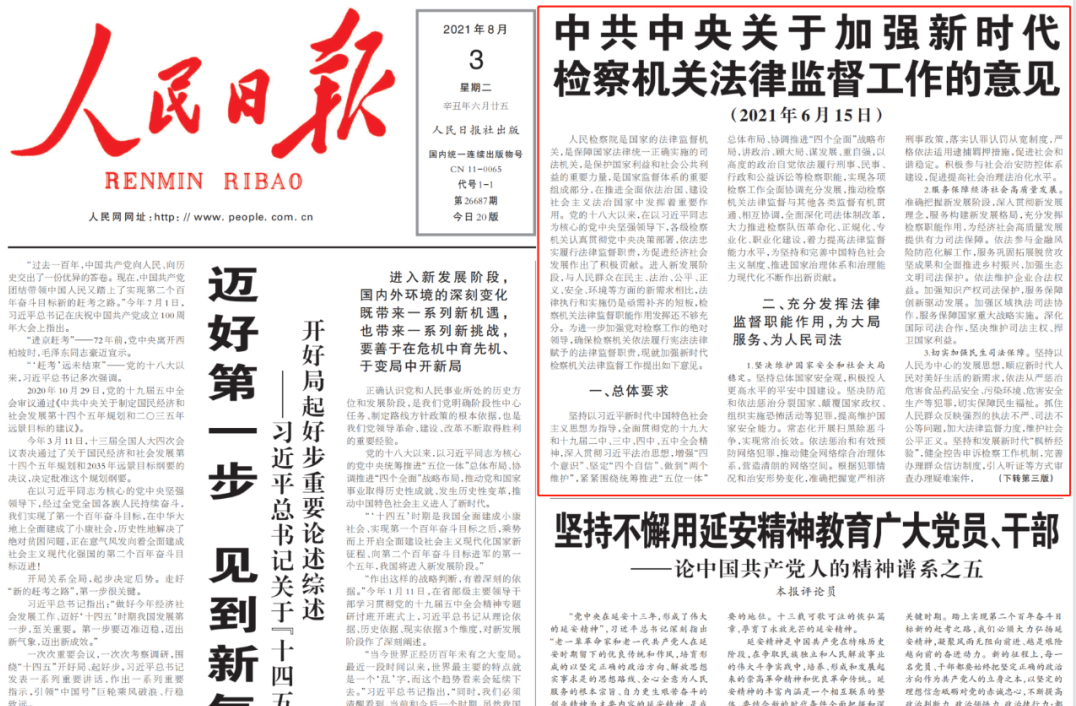 2021年,在“兩個(gè)一百年”奮斗目標(biāo)歷史交匯點(diǎn)上,在全國(guó)上下深入學(xué)習(xí)貫徹黨的十九屆六中全會(huì)精神的熱潮中,全國(guó)檢察機(jī)關(guān)認(rèn)真貫徹落實(shí)習(xí)近平法治思想,深入落實(shí)《中共中央關(guān)于加強(qiáng)新時(shí)代檢察機(jī)關(guān)法律監(jiān)督工作的意見(jiàn)》,強(qiáng)化政治自覺(jué)、法治自覺(jué)、檢察自覺(jué),忠誠(chéng)履職盡責(zé),推動(dòng)“四大檢察”“十大業(yè)務(wù)”取得了新進(jìn)展、新成效。為增進(jìn)社會(huì)各界對(duì)檢察工作的了解和支持,檢察日?qǐng)?bào)社組織開(kāi)展2021年度十大檢察新聞及十大法律監(jiān)督案例評(píng)選活動(dòng)。 |