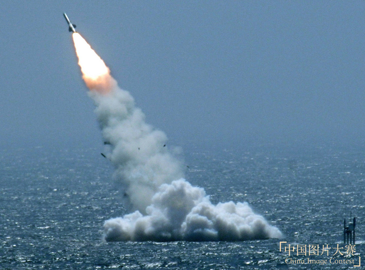 圖1:2005年8月,中俄海上聯(lián)合軍事演習(xí)拉開帷幕。中國潛艇在海上發(fā)射導(dǎo)彈。