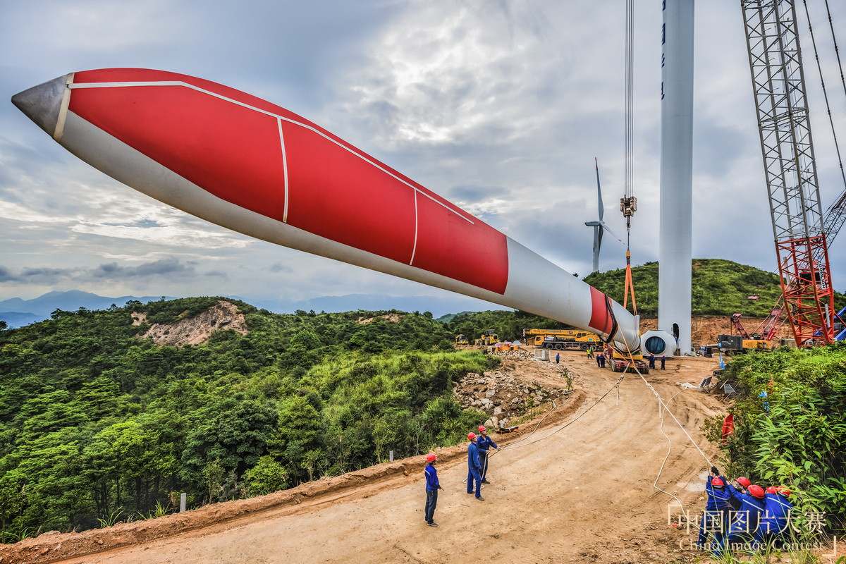 圖1:2018年7月2日,漳平市紅尖山風電場18號機施工現(xiàn)場,風機槳葉組裝。