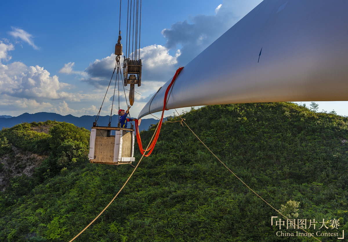圖2:2018年6月26日,漳平市紅尖山風電場19號機施工現(xiàn)場,風機槳葉與輪轂對接。