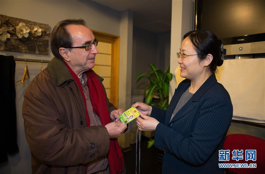 來自法國(guó)《阿爾薩斯最新消息報(bào)》的記者梅業(yè)(左)在領(lǐng)取兩會(huì)采訪記者證。 新華社記者 陳君清 攝 圖片來源:新華網(wǎng)