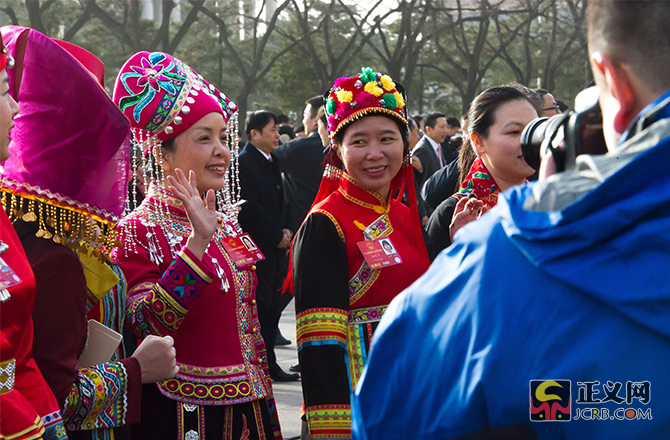 3月5日上午,第十二屆全國人民代表大會第四次會議在人民大會堂開幕,國務(wù)院總理李克強作政府工作報告,審查計劃報告和預(yù)算報告。廣西代表團代表著盛裝出席會議。正義網(wǎng)記者程丁攝