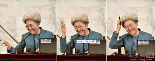 講真,今年正義君守著電視機(jī)看人大發(fā)布會(huì)的動(dòng)力之一,就是為了傅瑩女神!那滿頭銀發(fā)的韻味,輕柔但有力的聲音,充滿機(jī)敏和智慧的回答,以及真誠(chéng)甜美的笑容……這就是正義君心目中的女神!照片中是傅瑩回答提問時(shí),因說錯(cuò)記者媒體名稱覺得不好意思,靦腆又真誠(chéng)地笑起來,用夾著鋼筆的右手拍了拍腦袋,真是萌死正義君了!(紙?jiān)谀膬,正義君要擦鼻血……~~?????~~)