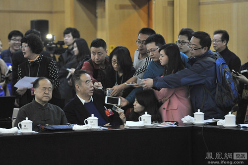 3月4日,全國(guó)政協(xié)十二屆四次會(huì)議展開分組討論,莫言與陳凱歌列席會(huì)議。陳凱歌受到一眾記者的圍訪,旁邊的莫言干脆閉目養(yǎng)神。莫言嘴唇緊抿,嘴角下垂,雙目緊閉,敢情這幾日也沒少被媒體圍攻,還不抓緊時(shí)間小憩一下!