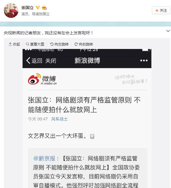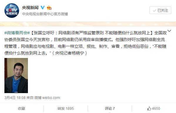 首先,是央視3月4日在其官方微博@央視新聞 上發(fā)表題為【張國立呼吁:網(wǎng)絡(luò)劇須有嚴(yán)格監(jiān)管原則 不能隨便拍什么就放網(wǎng)上】的微博,內(nèi)容為全國政協(xié)委員張國立強烈呼吁加強網(wǎng)絡(luò)劇全流程管理,網(wǎng)絡(luò)劇應(yīng)與電視劇、電影一樣立項、報批、制作、審看,拒絕低俗惡俗,“不能隨便拍什么就放到網(wǎng)上去!