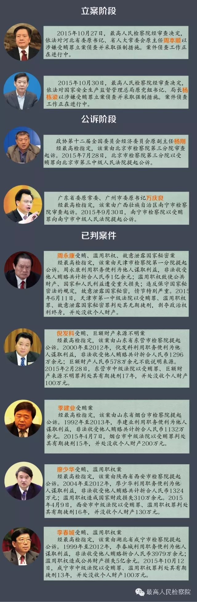 反腐無禁區(qū),在腐敗面前“沒有鐵帽子王”。無論多大的“老虎”,只要伸手,必被捉。2015年,檢察機(jī)關(guān)查辦了原省部級(jí)以上干部41人,如果一一列舉可得說上三天三夜了,檢察君就挑些“知名”大老虎吧。