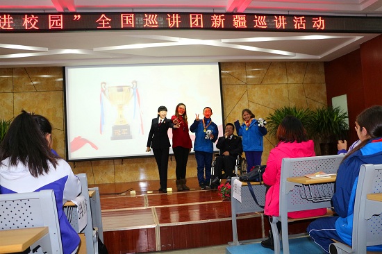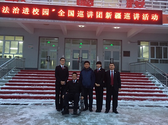 在巡講的過(guò)程中,亮哥因?yàn)槭中g(shù)后不久,剛開始的幾天只能坐著輪椅講課。同學(xué)們、老師們包括帶隊(duì)的領(lǐng)導(dǎo)、自治區(qū)檢察院公訴一處處長(zhǎng)張斌、巡講團(tuán)成員劉桂芳和劉國(guó)娟、乃孜福江及隨行的檢察、教育、新聞等部門的人員,都幫著抬輪椅、攙扶亮哥、打早飯等等。接下來(lái)的巡講,只要身體好一點(diǎn)亮哥總是堅(jiān)持站著給孩子們上課,即使我看到他痛的、累的汗流滿面。