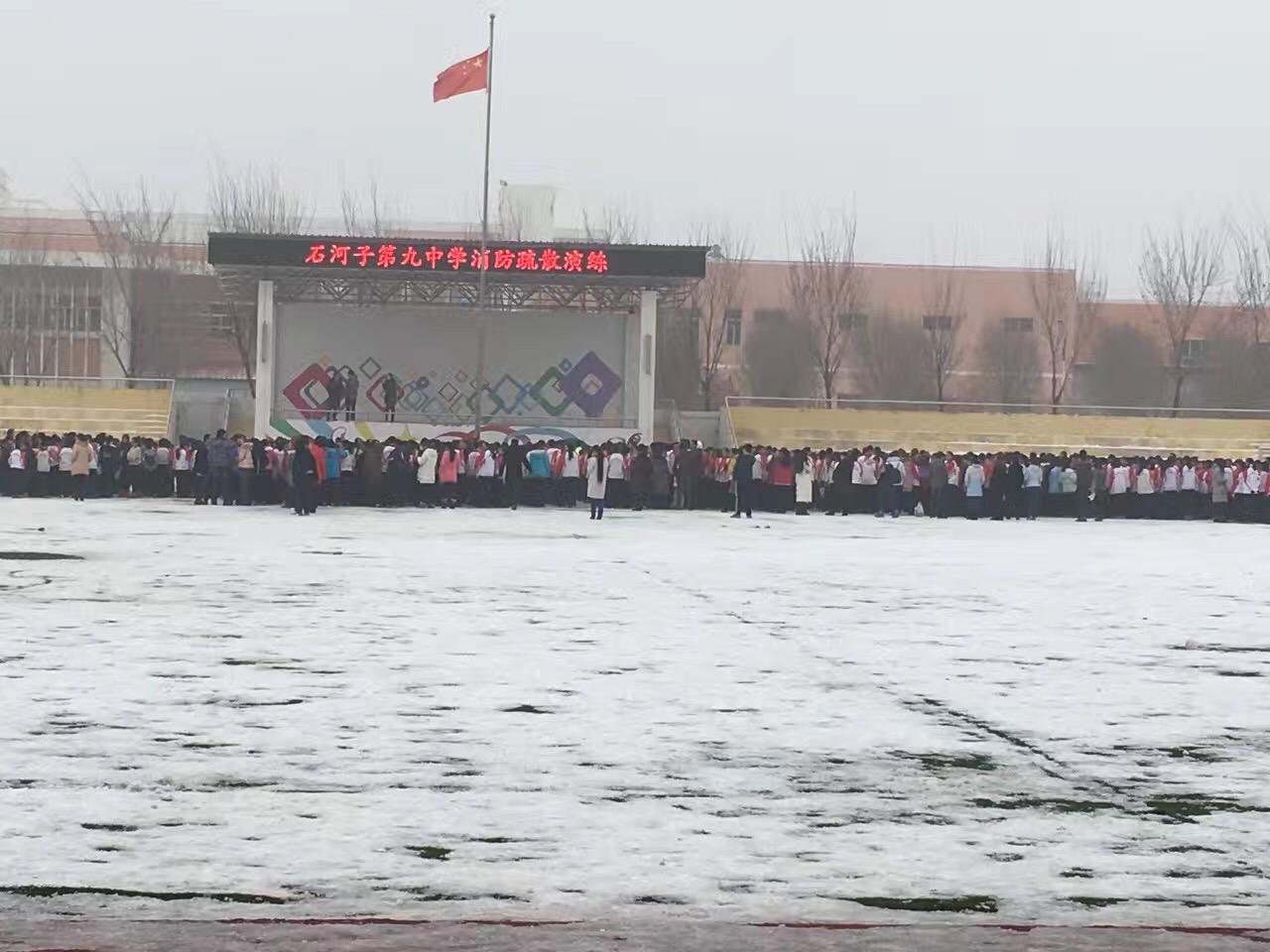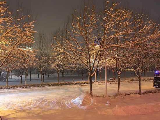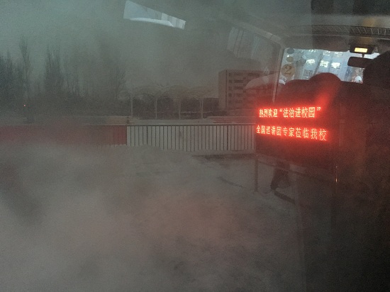 兩小時(shí)的時(shí)差,寒冷的天氣,室外溫度平均零下15度左右。在新疆的課程安排在上午十點(diǎn)開始,也是孩子們上課時(shí)間,為了保證上課效果我們都會(huì)提前一個(gè)小時(shí)左右到校調(diào)試設(shè)備,熟悉場(chǎng)地。每天出發(fā)時(shí),天空仍是微亮,厚厚的積雪,零星的行人,安靜且寒冷。到學(xué)校時(shí)天空還飄著雪花,同學(xué)們已經(jīng)在認(rèn)真的掃雪,用最美的校園迎接巡講團(tuán)。
