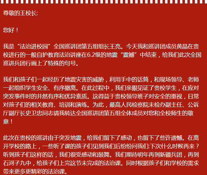 離別巡講,我和亮哥悄悄在入住賓館后商量來(lái)一個(gè)更加精彩、特別的結(jié)束。第二天也就是12月8日,我和亮哥正在新疆建設(shè)兵團(tuán)石河子第九中學(xué)給500多名師生上我們?cè)谛陆仓v的最后一堂課。剛好講到課程畫龍點(diǎn)睛最出彩的最后一個(gè)環(huán)節(jié),音控提高了音量,“激動(dòng)人心的時(shí)刻就要到了”亮哥話音未落,突然,距離巡講所在地僅57公里的新疆昌吉州呼圖壁縣發(fā)生震源深度為6千米的6.2級(jí)地震。瞬間,學(xué)校禮堂劇烈搖晃(高檢院帶隊(duì)的領(lǐng)導(dǎo)后來(lái)告訴我們,剛開始還猜想肯定是這兩人策劃的特殊結(jié)尾,音響也開得太大了,震動(dòng)的也太厲害了嘛!)兵團(tuán)的同事也想(昨晚就看他倆在悄悄商量,搞得動(dòng)靜也太大了吧!)